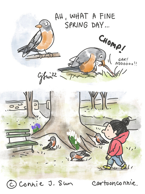 [Borderless 3-panel comic illustration of a fine spring day. Panel 1, a cheerful-looking red-breasted robin perches on a low branch. Text reads, "Ah, what a fine spring day!" Panel 2 cuts to the robin, on the ground, extracting a fat worm from the grass. Text reads, "CHOMP!" In smaller text, the worm goes "gak! noooooo!!" Panel 3 pans out and is a full-color illustration of a girl with a bun, enjoying the spring day, placidly observing the first burst of life and flowers in Central Park after winter. Several robins are foraging on the ground. Autobio comic strip by Connie Sun, cartoonconnie, titled "A Fine Spring Day," 2022.]