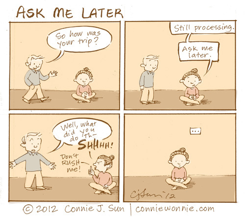 A Status Message a Day #107Connie SunJul 27, 2012ShareTriumph is making it to Friday with jet lag - YESS! *Self-pat on back*Note on below: I require a LOT of quiet time to process life. That's just the way it is.