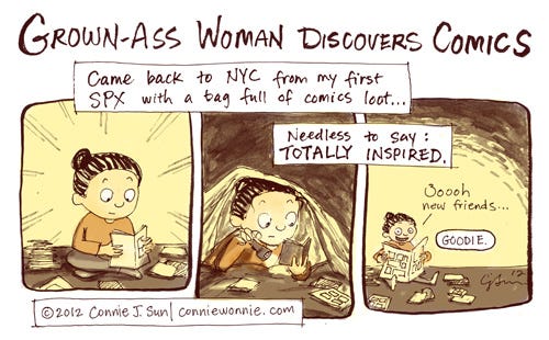 A Status Message a Day #112Connie SunSep 18, 2012ShareStill basking in the afterglow of SPX 2012. Who needs a man if you have comics? ;)