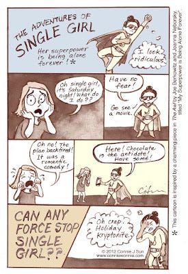 This cartoon is inspired by a charming piece in The Awl by Joe Berkowitz and Joanna Neborsky, titled "My Superpower is Being Alone Forever". Give it a read!