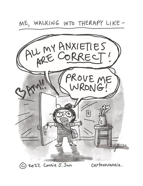 [Single-panel comic of a cartoon girl, hair in a bun, bursting through an office door with a look of dramatic defiance. The caption reads, "Me, walking into therapy like - BAM!!" while giant, confrontational speech bubbles dominate the composition and read, "ALL MY ANXIETIES ARE CORRECT! PROVE ME WRONG!" Original cartoon illustration by Connie Sun, cartoonconnie, 2022, all rights reserved.]