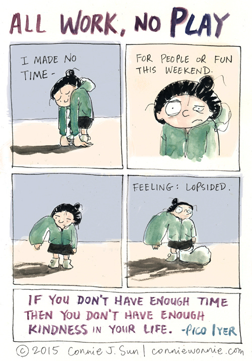 All Work, No PlayConnie SunMar 09, 2015ShareMonday morning mess. Apologies in advance to other humans I see today..."If you don't have enough time, then you don't have enough kindness in your life." - Pico Iyer