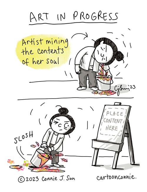 [2-panel comic of a cartoon girl with a bun, pouring out the colorful contents of her head into a paint bucket, titled "Art in Progress." Black and white, except for the multicolor accent. Panel 1: Girl's head is tipped over a bucket, with color paint coming out of her ears. Caption with an arrow: "Artist mining the contents of her soul." Panel 2: Girl drags a sloshing bucket purposely toward an easel and empty canvas that is embossed with the instructions, "Place content here." Cartoon illustration by Connie Sun, cartoonconnie, 2023.]
