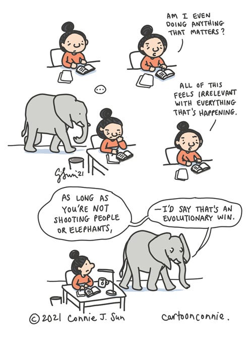 I'm also trying to remind myself that these are not isolated tragedies; there's something happening that is bigger than we are. At times, just getting through the day without doing too much damage is an evolutionary win.