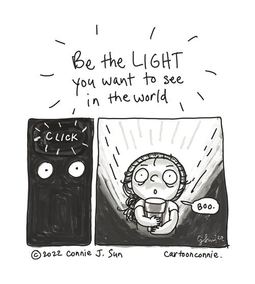 [Short black and white comic strip with the hand-drawn accented heading "Be the LIGHT you want to see in the world," followed by a panel painted in entirely in inky black, except for two bulging white cartoon eyes and the sound of a "click." The last panel shows a stage-lit cartoon girl with a braid, holding a flashlight under her face, looking spooky. A single speech bubble says, "Boo." Webcomic by Connie Sun, cartoonconnie, 2022.]