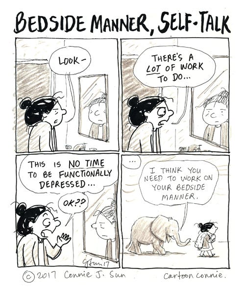 Bedside Manner, Self-TalkConnie SunOct 09, 2017ShareMaybe we all do.bedside manner phrase of bedside1. a doctor's approach or attitude toward a patient.