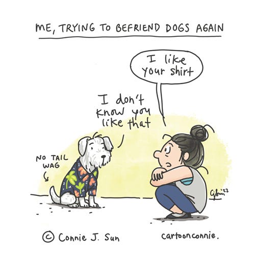 [Single-panel comic of a girl with a bun, trying to make friends again. Heading reads, "Me, trying to befriend dogs again." Girl tries to talk to a stylish dog in a Hawaiian shirt, in a hopeful bid for connection: "I like your shirt." The dog is indifferent, with no tail wag: "I don't know you like that." Autobio comic illustration by Connie Sun, cartoonconnie, 2022.]