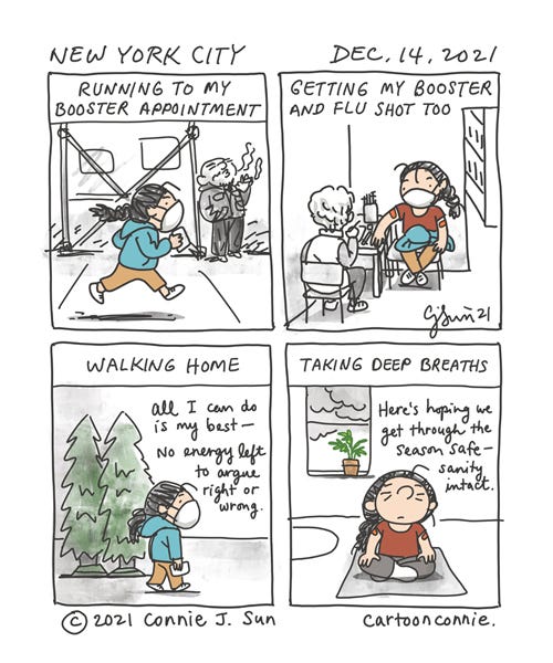 [4-panel diary comic about getting a booster shot in NYC. The comic is dated December 14, 2021. Panel 1 shows a girl with a braid and mask running past a man smoking under a scaffolding on a city sidewalk. Text reads, "Running to my booster appointment." In panel 2, she's seated in a room with a doctor who is administering her doses: "Getting my booster and flu shot too." She has red bandaids on both arms, from the 2 shots. In panel 3, she is "walking home," passed a sidewalk stand selling Christmas trees. Cursive text reads: "All I can do is my best -- no energy left to argue right or wrong." In panel 4, she is home, "taking deep breaths" on a yoga mat. "Here's hoping we get through the season safe -- sanity intact."]