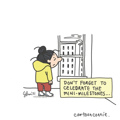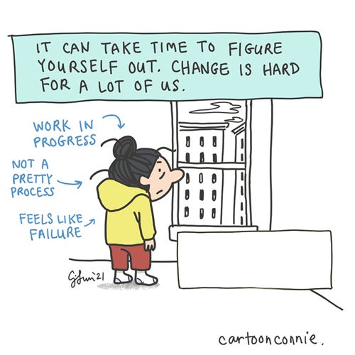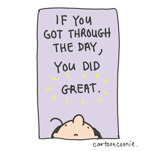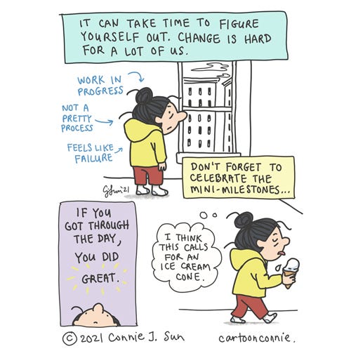 Cartoon text: "It can take time to figure yourself out. Change is hard for a lot of us. Don't forget to celebrate the mini milestones. If you got through the day, you did GREAT."