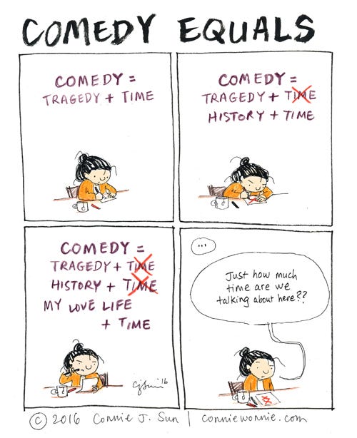 Comedy equals tragedy plus time. Plus my love life. ;)