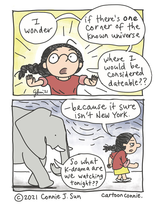 [Two-panel comic of a girl with a braid, musing wide-eyed, "I wonder...if there's one corner of the known universe...where I would be considered dateable??" Panel two shows girl walking off the comic with a deadpan expression: "-- because it sure isn't New York." Girl is followed by Elephant who asks conversationally, "So what k-drama are we watching tonight?"]