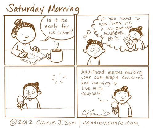 Early for Ice CreamConnie SunJul 30, 2012ShareWelcome to adulthood: where we are responsible for our own stupid decisions. Also, where it's possible to have ice cream for breakfast!