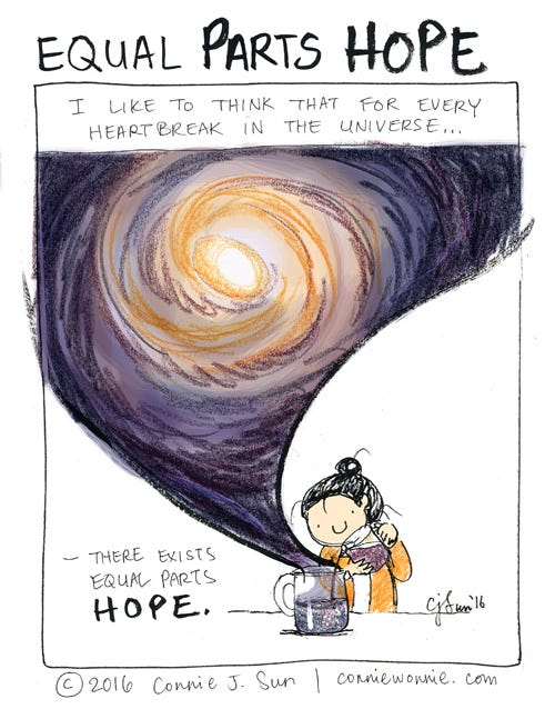 [Color pencil illustration comic of a cartoon girl with a bun pouring a pitcher of universe into a larger pitcher, against a backdrop lushly rendered purples and golden yellows. Text caption: "I like to think that for every heartbreak in the universe...there exists equal parts hope." Comic page titled "Equal Parks Hope" in bold ink script. Original illustration by Connie Sun, cartoonconnie, from 2016.]