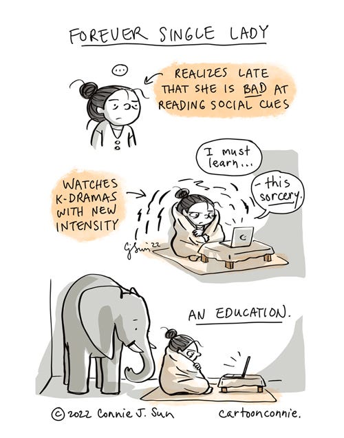 [3-panel comics page titled "Forever Single Lady." Panel 1, cartoon girl with a bun "realizes late that she is bad at reading social cues." In panel 2, she is huddled in a blanket in front of a laptop screen, with an expression of extreme concentration. Arrow points at her: "Watches K-dramas with new intensity." Speech bubbles read, "I must learn...this sorcery." In panel 3, she is drawn in side view, still huddled in front of a laptop, now with an elephant in the frame, observing the scene directly behind her. Caption reads, "An education." Comic illustration by Connie Sun, cartoonconnie, 2022.]