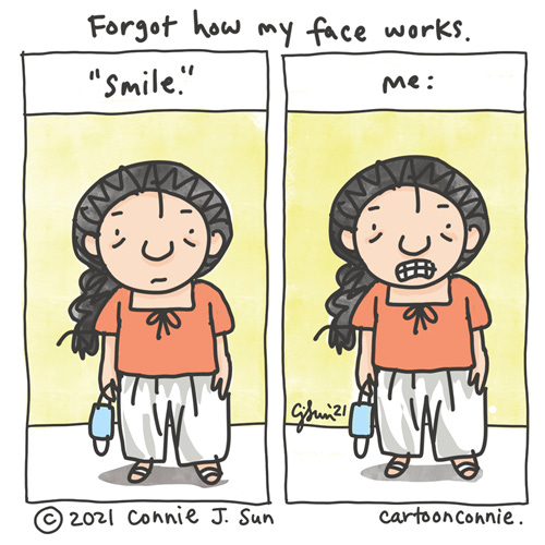 [Two-panel comic with panel 1 showing a simple drawing of a girl with a braid, holding a face mask in one hand with a flat, neutral expression on her face, with the instructions to "smile" in quotes. Panel two, labeled "me," is an identical image with no change, except that her mouth is in a painful grimace. Comic is titled, "Forgot how my face works."]