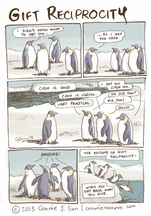 Gift ReciprocityConnie SunDec 25, 2013ShareThe epitome of gift reciprocity: cash or fish. One of those. Merry Christmas!