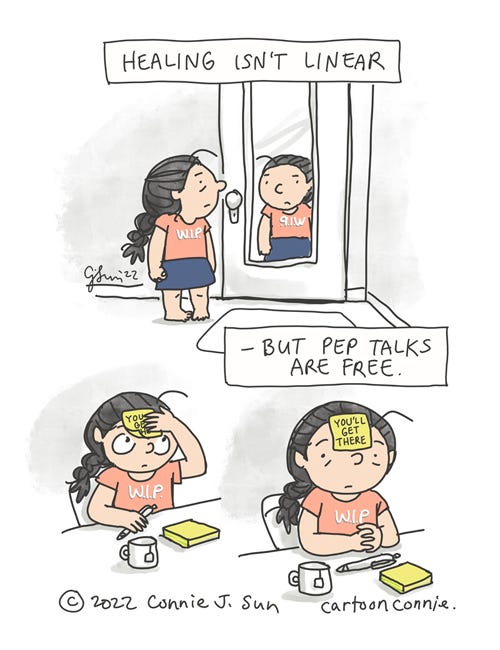 [3-panel comic of a cartoon girl with a braid, wearing a t-shirt with W.I.P. on it. Panel 1: She is looking into a mirror with a flat expression. Caption reads, "Healing isn't linear." Panel 2: She is at her desk with a post-it pad, pen, and tea mug, putting a bright post-it note on her head. Panel 3: Hands, folded in front of her, she patiently waits. Caption reads, "But pep talks are free." The post-it note on her forehead says, "You'll get there." (WIP = work in progress) Webcomic strip by Connie Sun, cartoonconnie, 2022.]