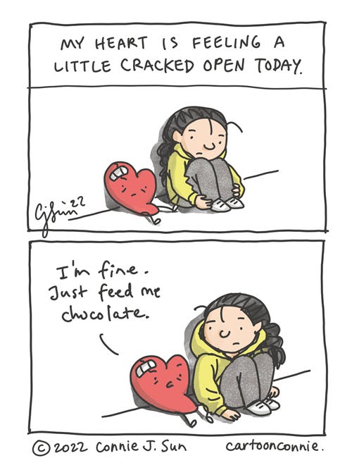 [Two-panel comic of a girl with a braid, sitting pensively with a throw-pillow-sized heart. The heart has a small bandaged wound, just a small gash. Panel 1 text reads, "My heart is feeling a little cracked open today." In panel 2, the heart, evidently not suffering too much, says, "I'm fine. Just feed me chocolate." Webcomic titled "Heart is okay," by Connie Sun, cartoonconnie, 2022.]
