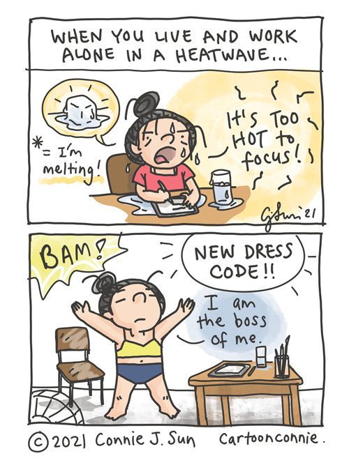 [Two-panel comic about when you live alone and work from home in a heatwave. Girl with a bun sweating over a desk complains that "It's too hot to focus" and that she's melting like an ice cube. Cuts to: Girl stands akimbo, arms out, in only underwear. She institutes a new dress code and declares: "I am the boss of me."]