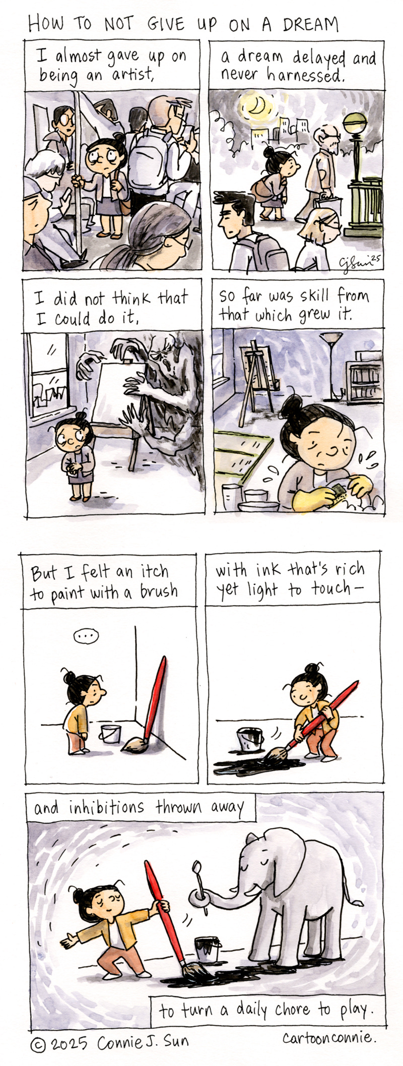 Being a messy perfectionist doesn’t help either. This is a 2011 sketch I did when I first started my daily practice of drawing in the morning, with a Tina Fey quote that I drew inspiration from: “There are no mistakes, only opportunities.” At the time, I had no formal art training and was new to the medium of comics. But in cartooning, I found something worth making mistakes for.