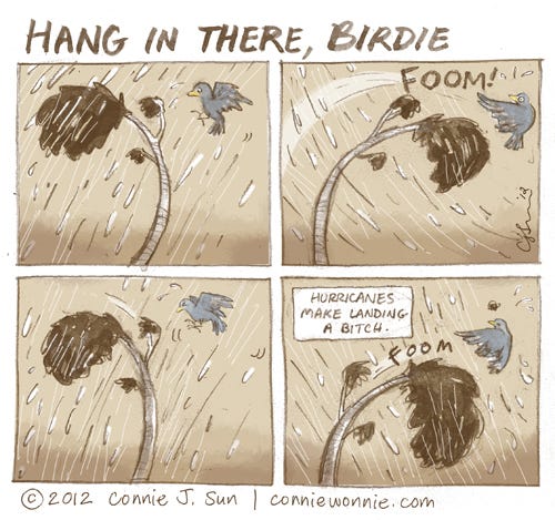 Hurricane LandingsConnie SunOct 31, 2012ShareWell wishes to those affected by yesterday's storm and big thanks to everyone working tirelessly around the clock to put the city back together again.From my window, I could see birds clinging to the tops of trees, but first they had to land...