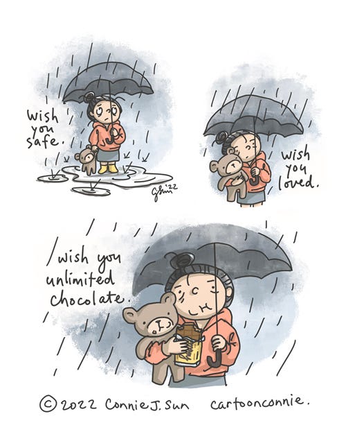 [3-panel borderless comic of a cartoon girl with a bun, standing in the rain with an umbrella, holding a teddy bear. In panel 1, she has a worried look, holds the bear by the hand. In panel 2, she holds the bear closer, squeezing it in a hug. In panel 3, she and the bear stand under the umbrella, eating a bar of chocolate together. Corresponding captions read: "Wish you safe. / Wish you loved. / Wish you unlimited chocolate." Original comic strip by Connie Sun, cartoonconnie, 2022.]