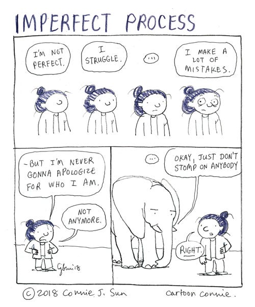 Imperfect ProcessConnie SunJan 11, 2018ShareGood advice from an elephant. Watch where you're going and don't stomp on anybody.