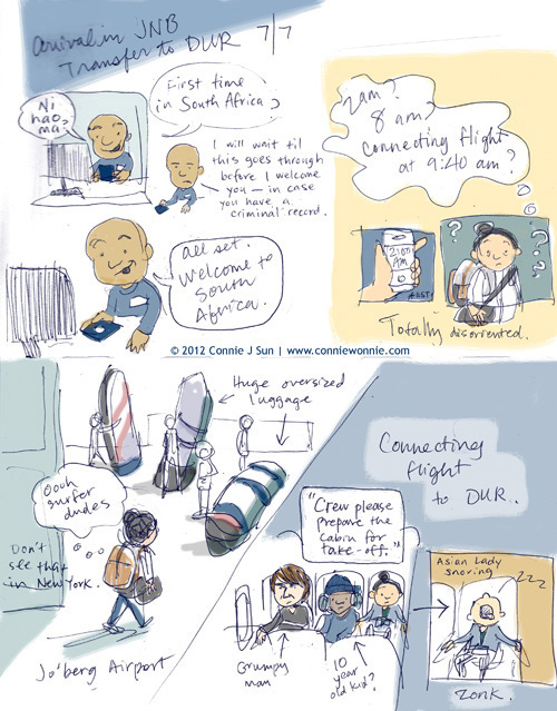 Jo'berg AirportConnie SunAug 07, 2012ShareThis is an illustrated chronicle of my journey from JFK ✈ JNB ✈ DUR last month. It is, more or less, straight from my sketchbook (colored in photoshop). Hopefully it's legible.