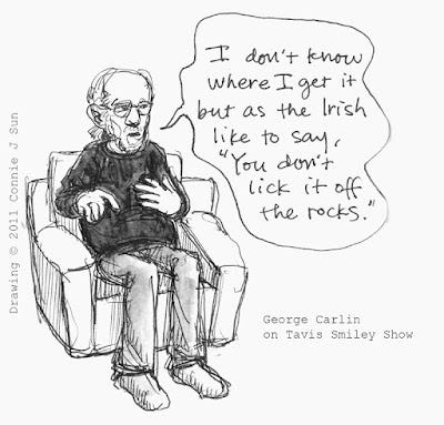 Licking It Off RocksConnie SunNov 17, 2011ShareTraveling today; homeward bound. Here's one for the road: an old sketch from earlier this year. Huge fan of Carlin, but I didn't say I could draw him!