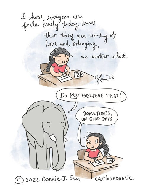 [Two-panel diary comic of a girl with a braid and cup of tea, writing at her desk. Panel 1, cursive script reads, "I hope everyone who feels lonely today knows that they are worthy of love and belonging, no matter what." In panel 2, an elephant appears in the frame and asks, "Do YOU believe that?" Girl answers, matter-of-factly, "Sometimes, on good days." Autobio webcomic strip by Connie Sun, cartoonconnie, 2022, titled "Lonely Worthy Today."]