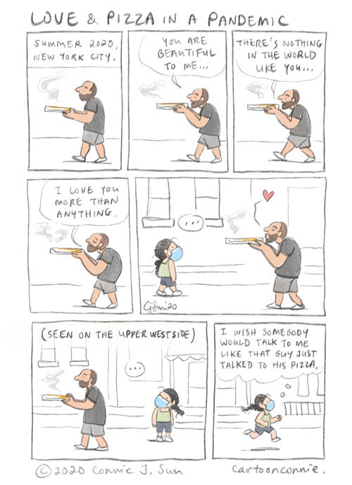 I saw a guy walking and talking to his pizza yesterday and thought, "This is the most romantic New York thing I've seen during this pandemic."