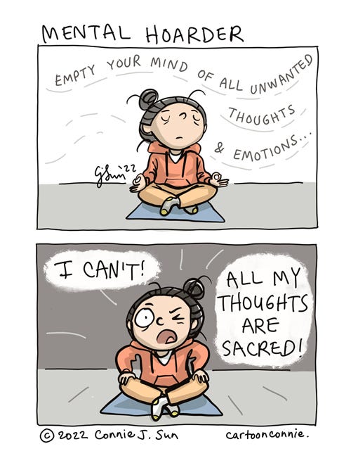 [2-panel comic of a cartoon girl with a bun, sitting in half lotus, meditating. In panel 1, her expression is neutral and undulating text reads, "Empty your mind of all unwanted thoughts and emotions." In panel 2, she retorts in all caps: "I CAN'T! ALL MY THOUGHTS ARE SACRED!" Comic strip titled "Mental Hoarder" by Connie Sun, cartoonconnie, 2022.]