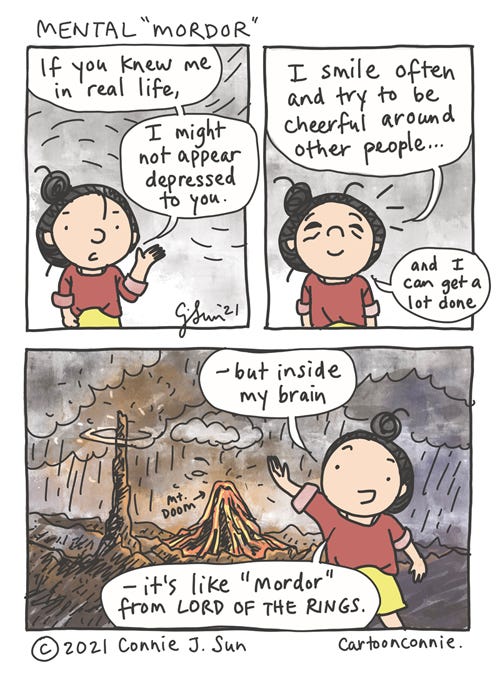 [3-panel comic in which a girl with a bun explains, "If you knew me in real life...I might not appear depressed you." In panel 2, she goes on to say, "I smile often and try to be cheerful around other people...and I can get a lot done." She is smiling but tired expression on her face. In panel 3, she is super upbeat and more animated, against a dramatically rendered background, depicting an uninhabitable, high fantasy hellscape, with a volcano erupting and dark stormy clouds swirling. Speech bubble: "- but inside my brain, it's like 'Mordor' from Lord of the Rings." Comic titled "Mental Mordor."]
