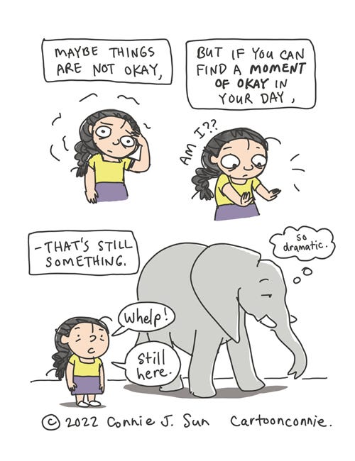 [3-panel comic of a cartoon girl with a braid fretting. In panel 1, caption reads, "Maybe things are not okay..." In panel 2 , the girl startles, looks at her hands and thinks, "Am I??" while the caption says, "But if you can find a moment of okay in your day..." Panel 3 text continues, "-- it's something." Girl says, "Whelp! Still here!" while an elephant ambles by unfazed and thinks "so dramatic." Comic strip by Connie Sun, cartoonconnie, 2022.]