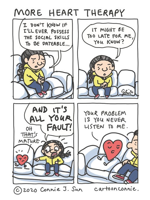New comic about working through difficult emotions in therapy, blaming behaviors, and learning the social skills to be "dateable."