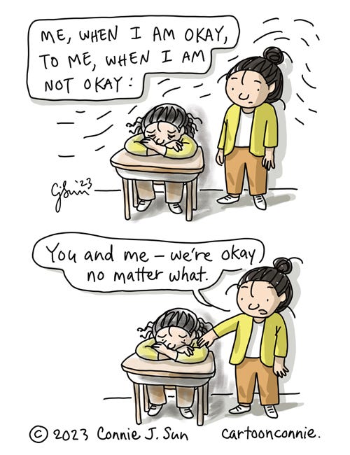 [2-panel comic illustration of a cartoon girl with a bun, drawn in bright solid colors. She is standing next to another version of herself, sitting hunched over a desk, looking sad, and rendered in duller, more scribbly color. In panel 1, the caption reads, "Me, when I am okay, to me, when I am not okay." In panel 2, the girl puts her hand on the seated girl's shoulder and says, "You and me - we're okay no matter what." Cartoon titled "More Okay." Original artwork by Connie Sun, cartoonconnie, 2023.]