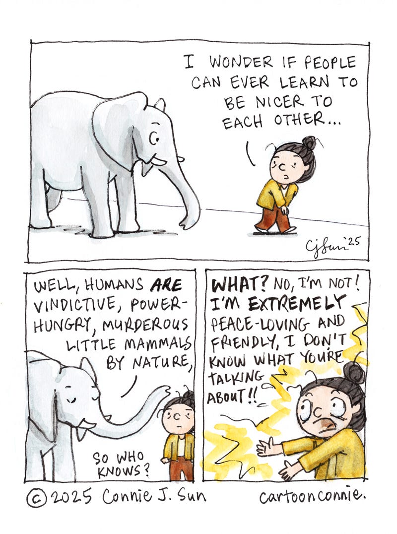 Cartoon description: 3-panel comic strip of a cartoon girl with a bun, talking to an elephant. In panel 1, she says, "I wonder if people can ever learn to be nicer to each other..." In panel 2, the elephant responds, "Well, humans ARE vindictive, power-hungry, murderous little mammals by nature, so who knows?" In the final panel, the girl is indignant: "WHAT? No, I'm not! I'm EXTREMELY peace-loving and friendly, I don't know what you're talking about!" Comic titled, "Murderous Little Mammals," ink and watercolor on paper, original artwork by Connie Sun, cartoonconnie, 2025.
