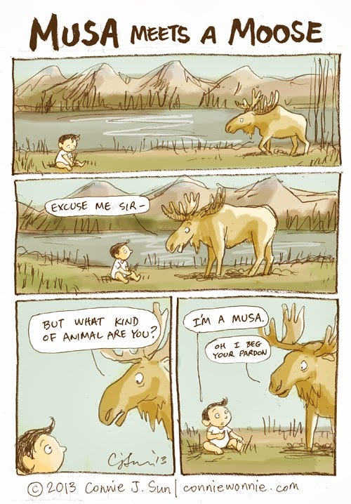 Musa Meets a MooseConnie SunSep 04, 2013ShareThis cartoon will only make sense if you're my friends Milton and Nermeen, who have an adorable Musa. For you :)