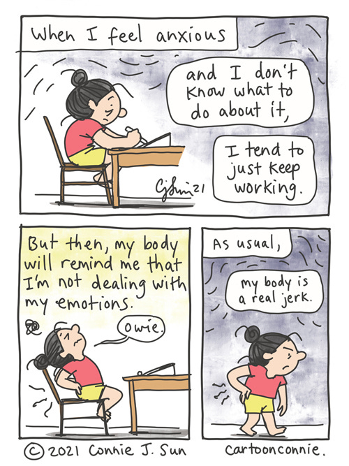 [3-panel comic of a girl with a bun, drawing at a desk. Text reads: "When I feel anxious and I don't know what to do about it, I tend to just keep working." In panel 2, she arches her back in pain and says "owie." Text reads: "But then, my body will remind me that I'm not dealing with my emotions." Panel 3, she walks off, holding her aching back, scowling: "As usual, my body is a real jerk." Titled "My body doesn't life, but sometimes it's a jerk."]
