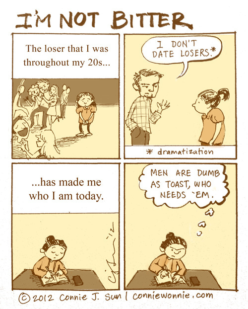I'm Not BitterConnie SunSep 24, 2012ShareNot bitter at all. Men are dumb, that's just a fact ;)This is a smart phone scan, colored in Photoshop. My regular scanner is not working, so this will have to do.
