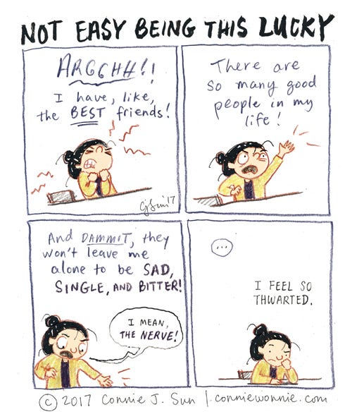 Not Easy Being This LuckyConnie SunMay 01, 2017ShareOld maid, the struggle ;)S/O to my supremely patient friends.