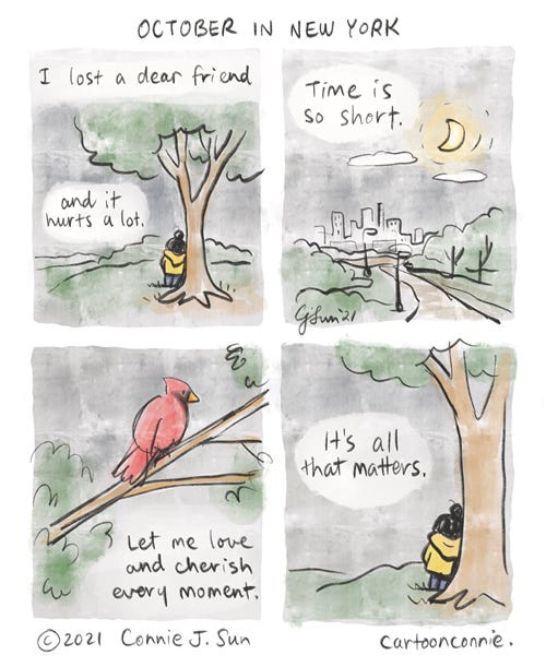 [4-panel diary comic of a girl with a bun leaning against a tree, grieving the loss of a friend. "I lost a dear friend...and it hurts a lot." Panel 2 is a rough sketch of a Central Park path under a crescent moon with a cityscape in the background, drawn from memory. Text reads: "Time is so short." Panel 2 shows a cardinal bird sitting on a branch. Text reads: "Let me love and cherish every moment." Panel 4 zooms back in to the girl leaning against a tree: "It's all that matters."]