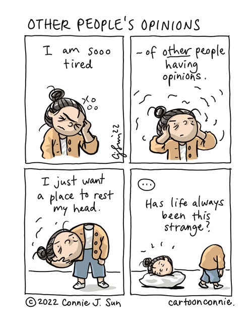 [4-panel comic strip about experiencing information overload in an opinion-saturated modern world. In panel 1, a cartoon girl with a bun raises a hand to her temple in exhaustion. In panel 2, she cradles her head in her hands, covering her ears. Caption reads, "I am so tired -- of other people having opinions." In panel 3, she has popped her head off her shoulders and is holding it under her arm, saying "I just want a place to rest my head." In panel 4, she has placed her head on a pillow cushion on the floor, as her headless body walks off the frame. There's a beat and the caption reads, "Has life always been this strange?" Original cartoon titled "Other People's Opinions" by Connie Sun, cartoonconnie, 2022.]