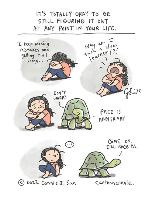 [4-panel borderless comic strip of a cartoon girl with a braid, hugging her knees. The heading reads, "It's totally okay to be still figuring it out at any point in your life." Panel 1, the girl has her head down and says, "I keep making mistakes and getting it all wrong..." Panel 2, she flips her head back and exclaims, "Why am I such a slow learner!?!" In panel 3, a tortoise ambling by says wisely, "Don't worry. Pace is arbitrary." In panel 4, there's a beat, then the tortoise starts walking off and adds, "Come on, I'll race ya." Cartoon by Connie Sun, cartoonconnie, 2022.]