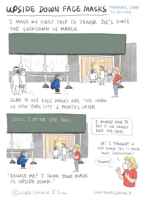 Slice-of-life diary comic about wearing face masks in NYC. Plus, first shopping trip to Trader Joe's since the city locked down 2 months ago! It was about a 40-minute wait to get inside, but the staff are as nice as ever.