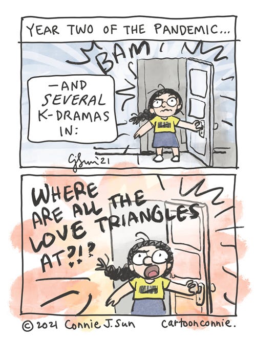 [Two-panel comic about being in year two of the pandemic and several k-dramas in. Girl with crazed expression busts through a door and calls out, loudly, with emphasis: "WHERE ARE ALL THE LOVE TRIANGLES AT?!?"]