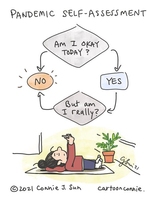 [Single-panel comic of a girl with a bun, laying supine on a mat, looking up at her phone. Above her is a simple flowchart that reads "Am I okay today?" Arrows point to yes or no. Yes leads to another question: "But am I really?" which circles back to no. Titled: "Pandemic Self-Assessment"]