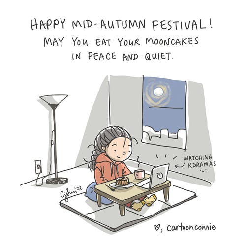[Single-panel comic illustration of a cartoon girl with a braid celebrating Mid-Autumn Festival in peace and quiet. She is seated at a low table, dressed in comfy clothes, with a cup of tea and a mooncake, in front of a laptop. The full moon is visible outside the apartment window. Caption: "Happy Mid-Autumn Festival! May you eat your mooncakes in peace and quiet." She is blissed out, "watching kdramas." Illustration by Connie Sun, cartoonconnie, 2022.]