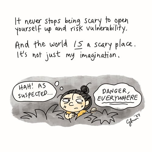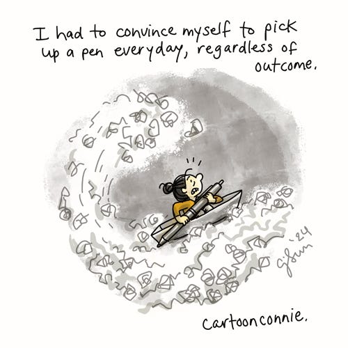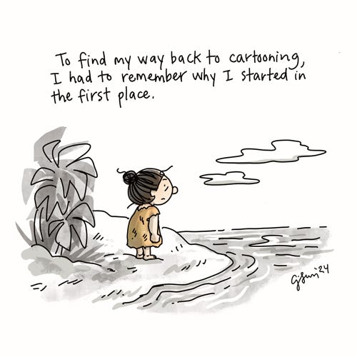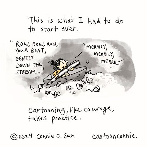 I definitely struggled to come back to cartooning, but I'm glad I convinced myself to be braver than I felt in this instance. Often, all we can do is be a little bit brave, everyday.