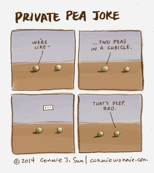 Private Pea JokeConnie SunApr 11, 2014ShareI overheard two coworkers talking. We're all just glad it's Friday.